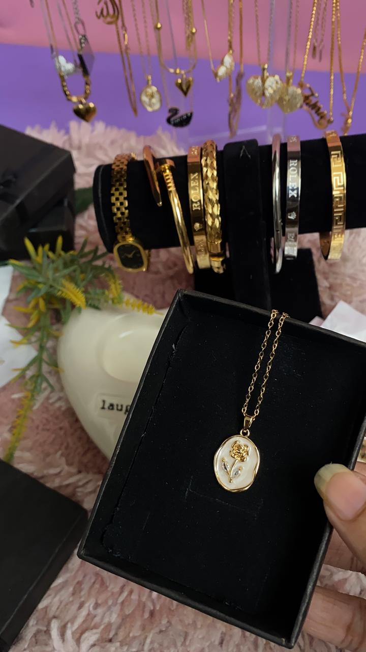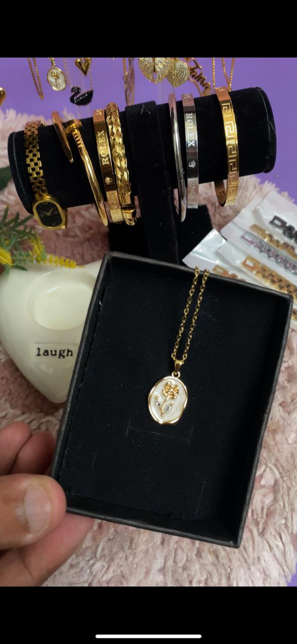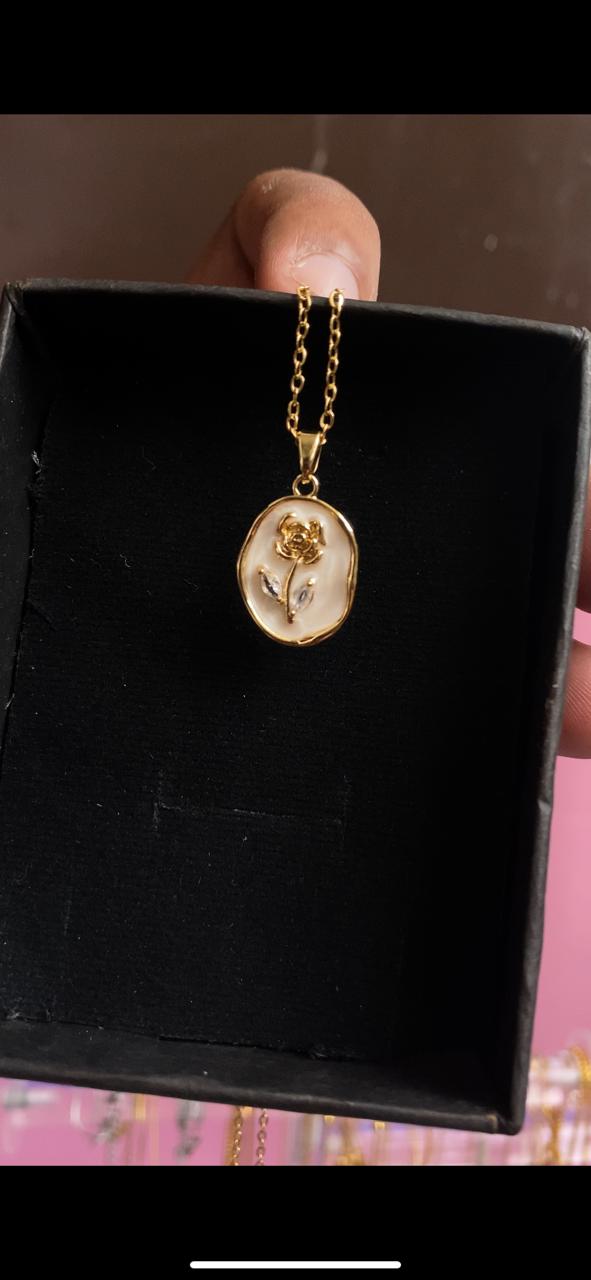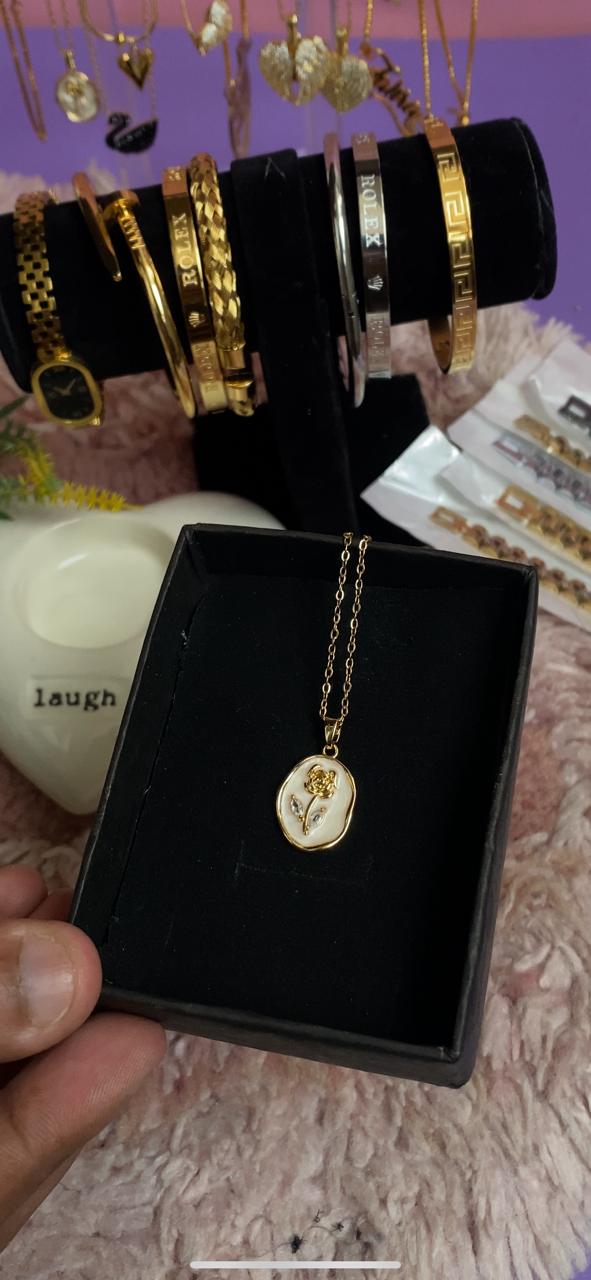 This elegant pendant showcases a beautifully detailed golden rose on a glossy pearl-like base, symbolizing love, purity, and timeless beauty. Its oval medallion design adds a touch of vintage charm, perfect for any occasion.